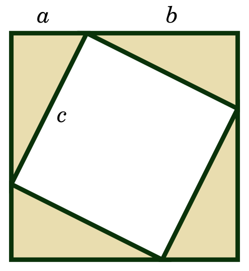 The sum of the area of the small square and four triangles equals the area of the big square: c^2 + 4\cdot\frac{1}{2}\cdot a\cdot b = (a+b)^2.